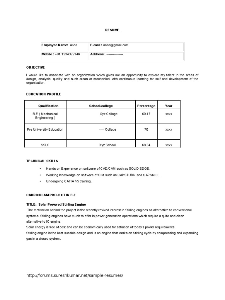 It lets the readers know what to expect from the resume, especially if you are a fresher. Fresher mechanical engineering jobs 2021: I want professional summary of mechanical engineer with 1 yr experience in assembly. Download fresher mechanical engineer resume format. It is mainly the ability to resolve queries and issues that is related to pensions, tax filing, insurance policies, and regulations. Writing a strong summary gives you a chance to show off your professional. File contain mechanical fresher sample resume format in pdf and doc format. Check out these resume headline samples for different as a fresher, your resume headline should focus on internship experiences relevant to the job profile and personal attributes that can contribute to the job. How to format a resume correctly? Chegg india offers flexible work opportunities to teachers, professors, working professionals, and fresh graduates to join as subject experts and contribute quality solutions for chegg's q&a board and textbook solutions. This section of your resume should focus on tools, including computer programs, used to gain experience in your field of expertise and technical skills. You can also check a sample resume i have written for mecahnical engineering freshers. We have prepared some mechanical engineer fresher resumes for you to take.